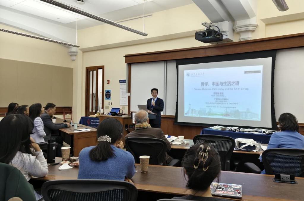 在美期间,黎锦城一行还受邀前往哥伦比亚大学,作了题为“哲学、中医药及生活之道”的中医药文化专题宣讲会,向哥伦比亚大学的师生及当地民众介绍中医药的历史、理论体系、日常生活应用等。黎锦城以生动的语言和丰富的案例阐释了中医药在疾病预防、养生保健和慢性病管理中的独特优势,特别强调了中医药作为中华优秀传统文化瑰宝的深厚底蕴与现代价值。